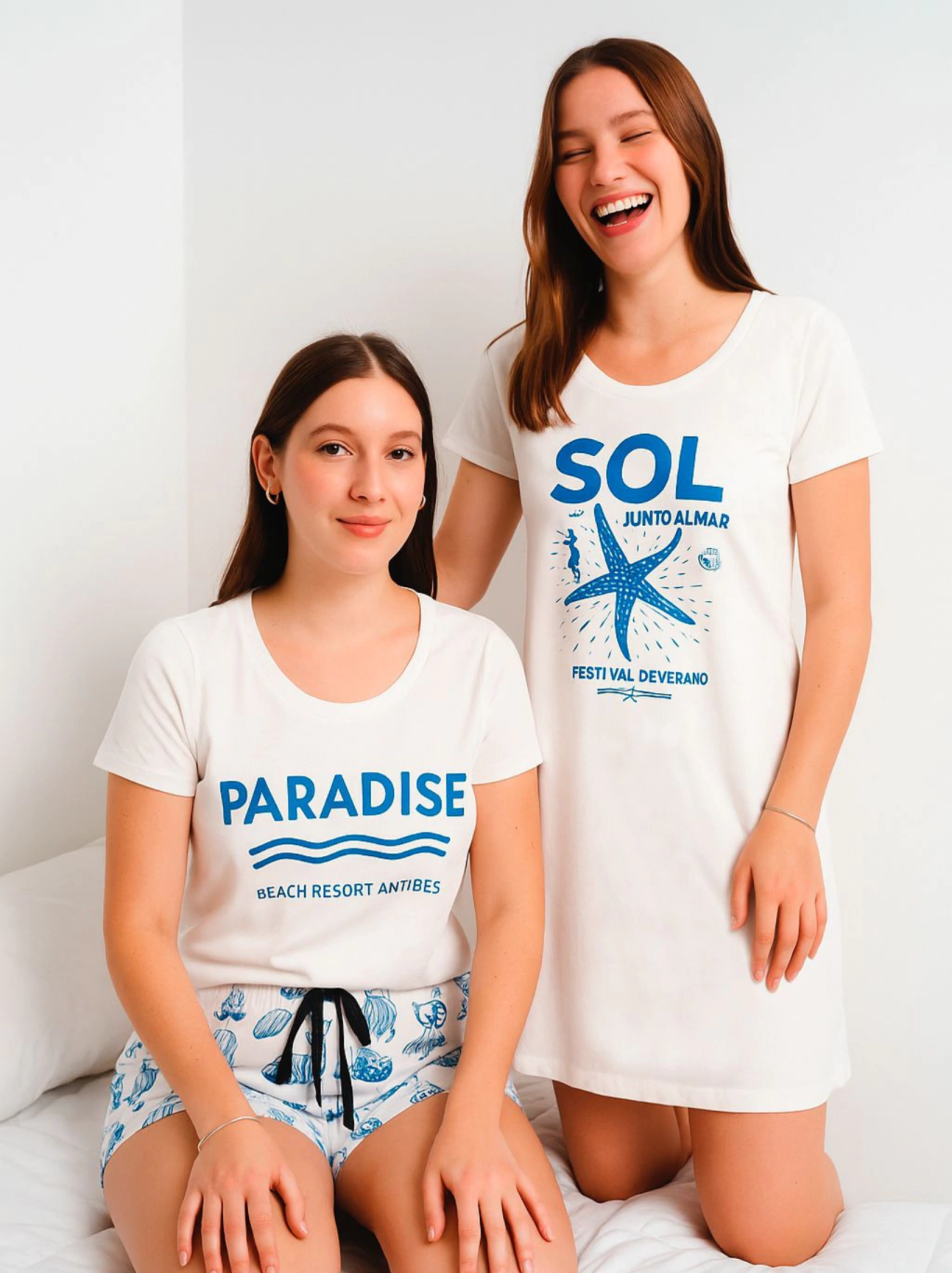 Camisón corto de algodón estampado con vinilo. Es mangas cortas y tiene un calce recto; con tajo en ambos laterales. El tejido es suave.
