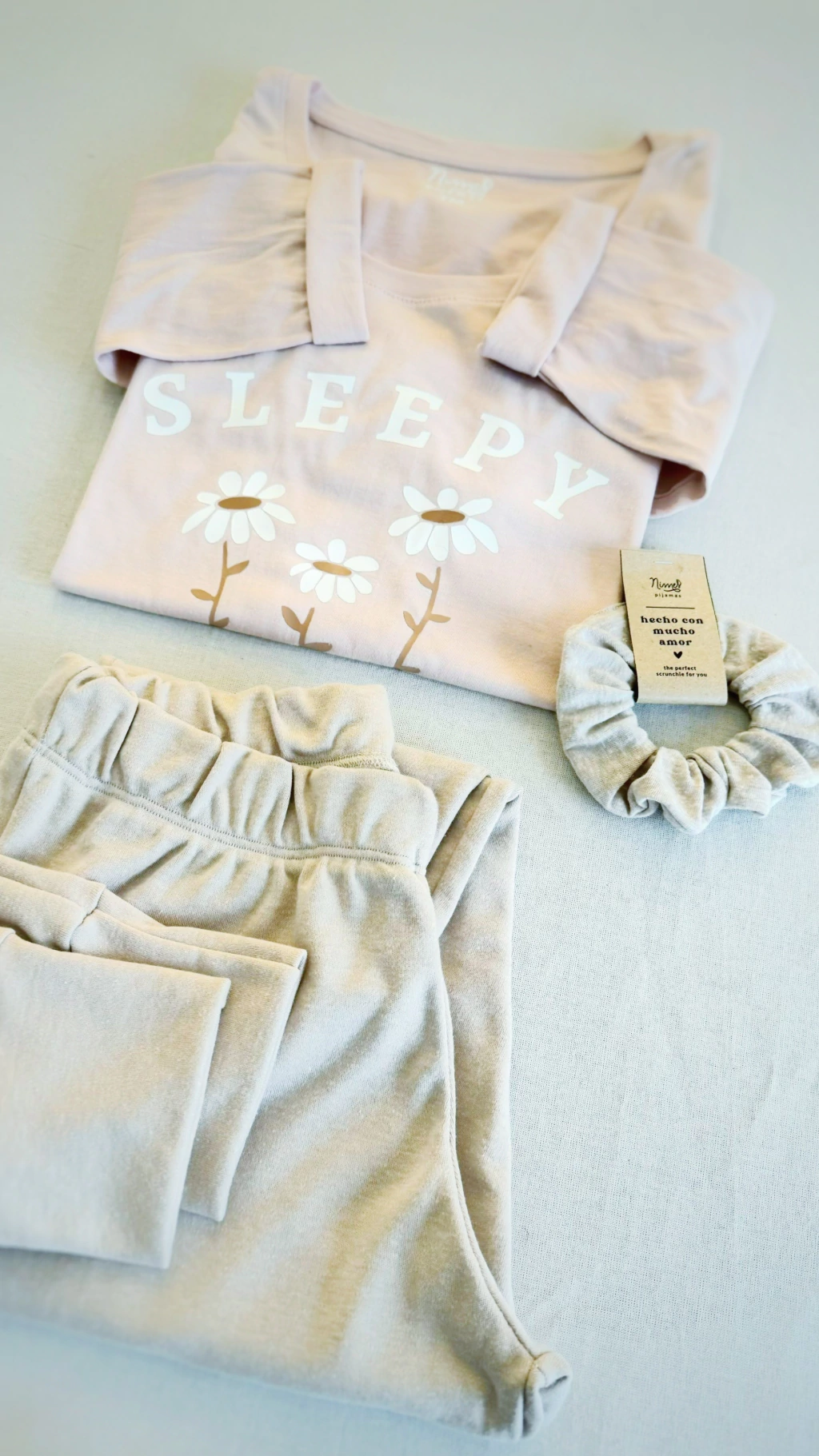 Pijama compuesto por una remera estampada de algodón y pantalón chupin estampado corazones de interlock. La remera es mangas largas de jersey de algodon 30/1 con estampado de vinilo y tiene un calce recto. El pantalón chupin es tiro medio con cintura elastizada y puños en tobillos, de tela interlock 100% algodón super abrigada y pesada. El tejido es suave y de una calidad excelente.